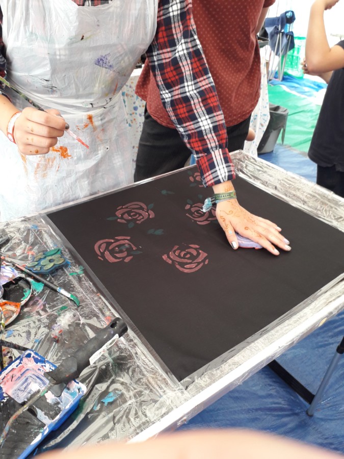 We first met the Bandana Lady at Beautiful Days 2015, and were delighted to see that she had returned with her workshop this year. She is such a remarkable free spirited, friendly lady. I was so impressed that she even remembered us, as hundreds of children must visit her at every festival. She remembered the design that my son had used three years ago!