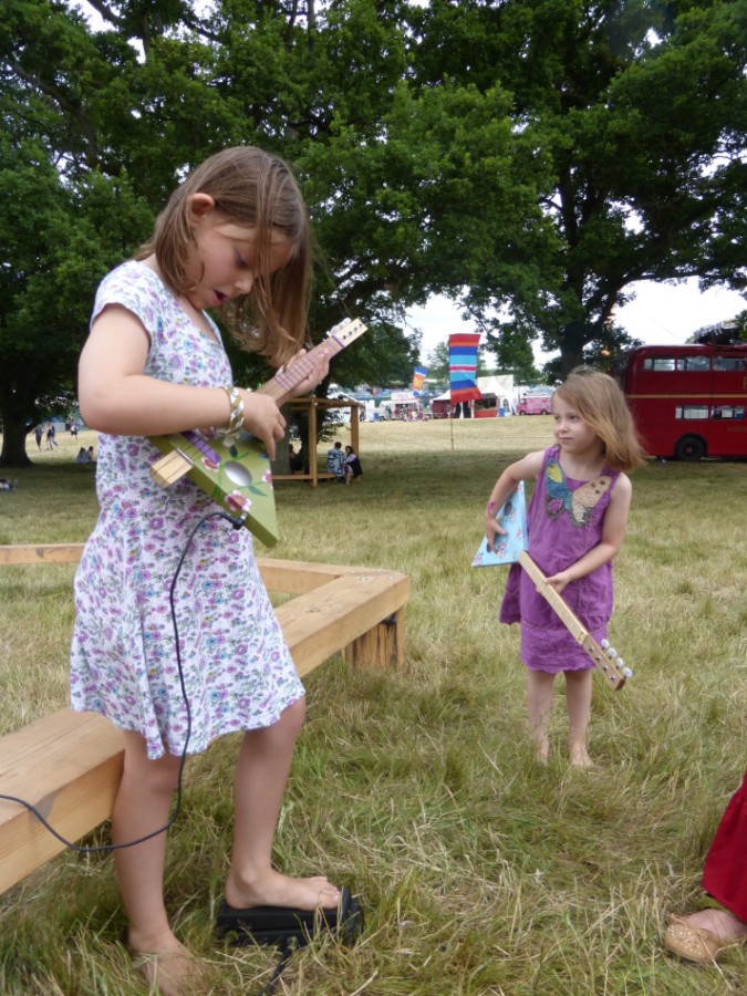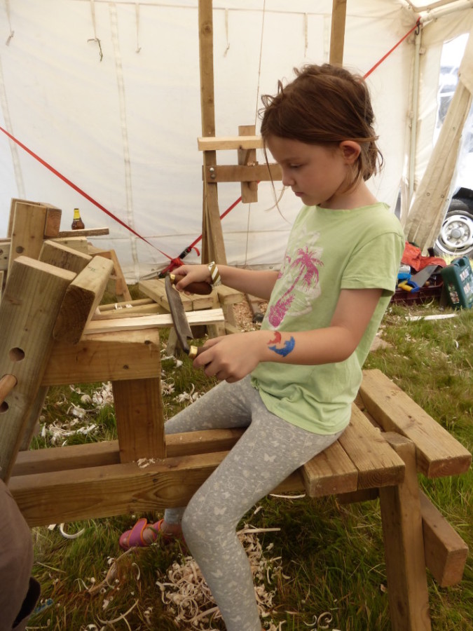 The Crafts area was up near the main stage, with lots on offer for both adults and children. The children spent a long time making pendants out of slate, and my eldest went on to make a wooden spatula, and a wooden pen turned on a lathe. She took a huge shine to the electric wooden lutes and played them at every opportunity, even learning a little tune.