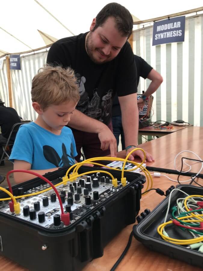 The Science tent was much emptier today, which gave them a chance to try lots of activities including learning how to pimp your paper aeroplane, a giant marble run including pipes, an old bath and a fire pit, soldering, using pedal power to generate electricity and creating digital music using a mixer and Ableton software.