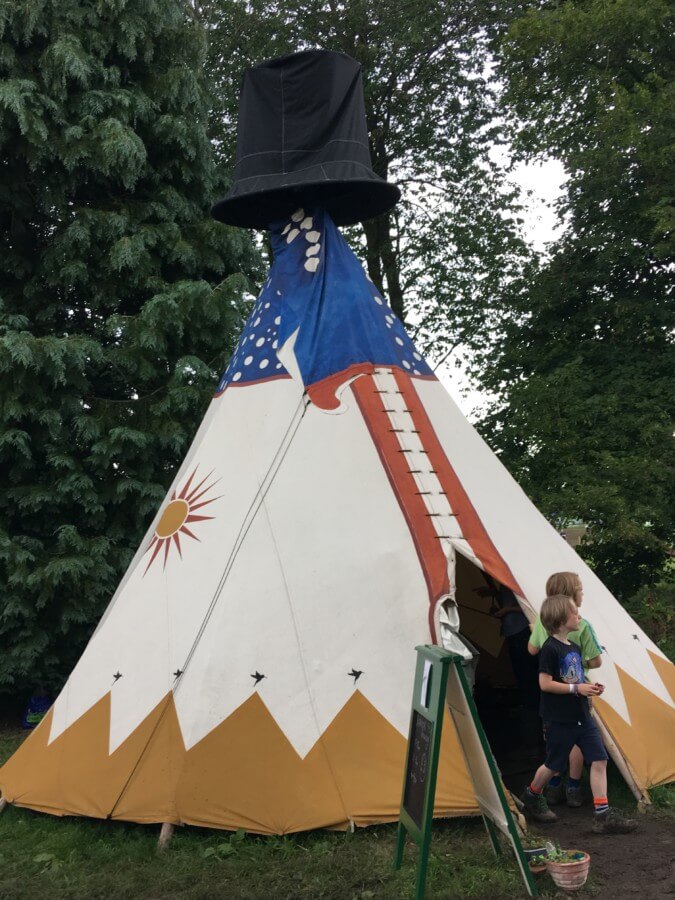 Because of the rain, we had missed most of the theatre performances, which I had been looking to watching, but despite the mud the Wilderwild area was a hive of activity, with amazing looking dens, two kids were bravely having a go at black smithing, another child was cooking a pizza over the campfire whilst another was finishing off making a wooden stool with a saw.