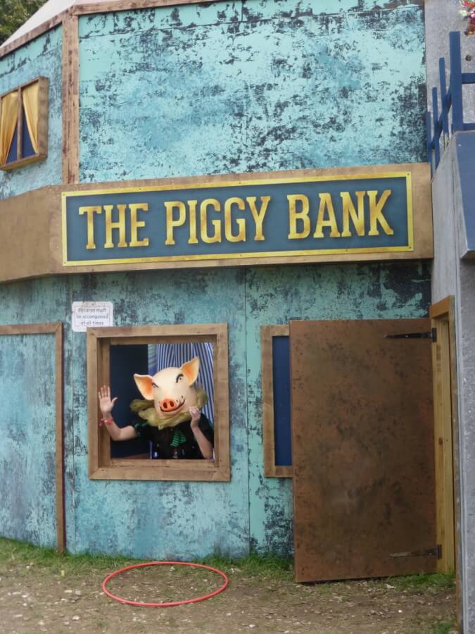 They could visit the post office and get a passbook to fill up with stamps. Then in order to get a stamp, you had to go to the Piggy Bank and get money from the Piggy Bankers. Except the Piggy Bankers didn’t want to give you any money, and made you beg for it and then literally jump through hoops (hula hoops). Or do a dance, or generally be humiliated. It was a lot of fun.