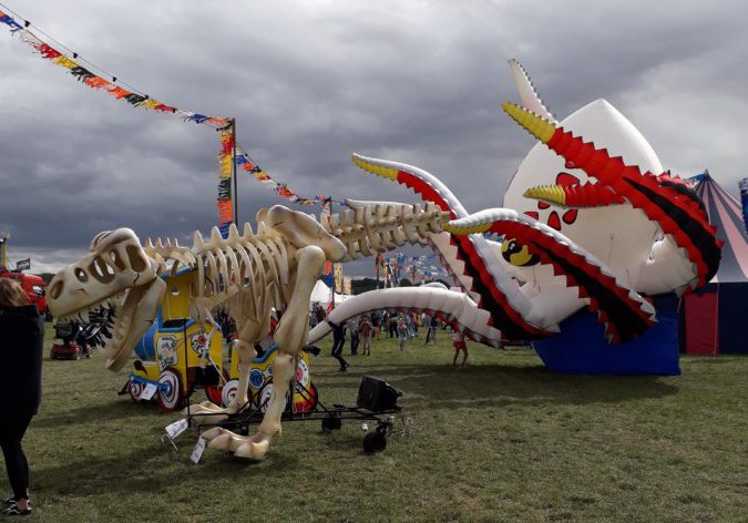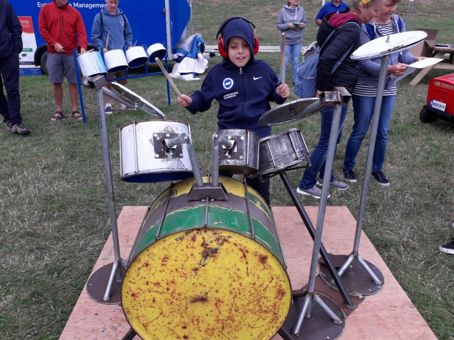On our way through the festival, we happened upon a big skiffle set put on by Grundon Event Waste Management. It was wonderful – full of paint pots to bang and pipes to hit. We spent ages there until the rain started when we went to hide in the boot of a Mercedes van!