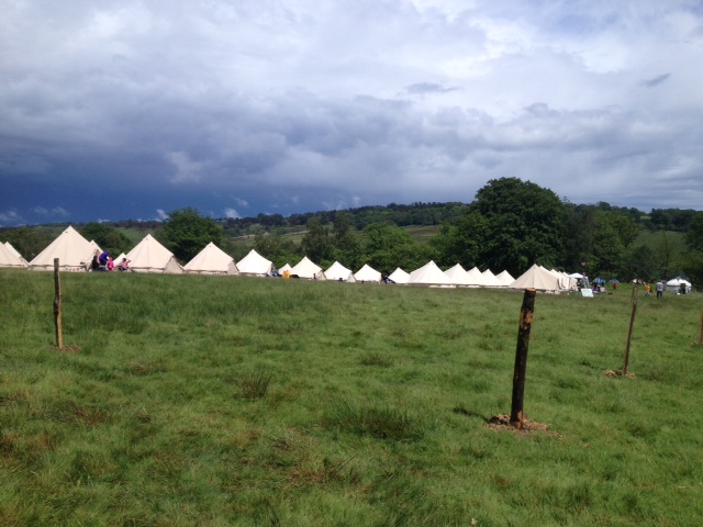 There was very little direction about where to camp. Most people could camp no more than a ten minute walk from their car but as the terrain was so hilly with long grass we were thankful for our wheelbarrow. The majority of the family camping was on a hill, at the top the great views compensated for a sloping tent and uneven site, lower down the hill was flatter ground and you were closer to the loos. Camper vans parked at top of site, intermingled with tents and awnings. The glamping site was elsewhere on flatter ground, largely comprising of bell tents, located near the woodland stage, in easy access of a great café and late night bar.