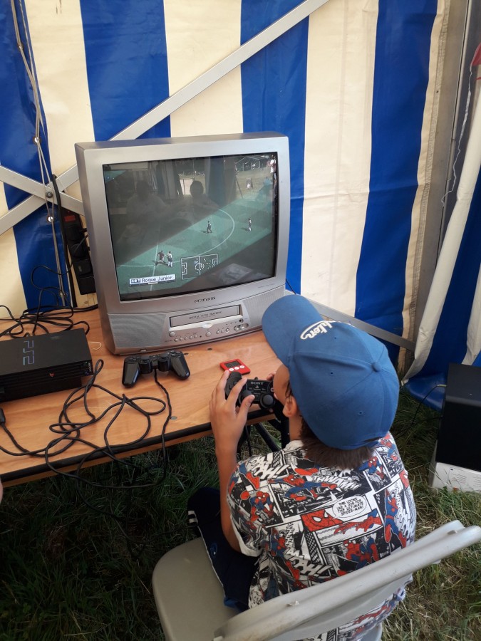 For a small donation to charity, children and adults could spend some time playing old school games such as Goldeneye, and (my son’s favourite) Pro Evolution Soccer. Whilst I love that festivals are a great way for children to relearn how to have fun without screens, sometimes my son needed some down time, and the games were ideal. After my son had exhausted himself and bumped his head in the adventure field, five minutes playing Pro-Evo was just what he needed to reboot himself!