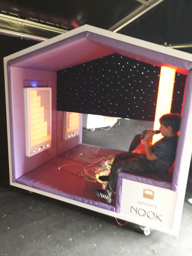 This was their first ever time at a festival. Sensory Nooks are an astonishing interactive sensory experience. There were five areas each stimulating a combination of the senses. Each had a light tube and a control panel to alter the colours. My son really enjoyed the area that concentrated on audio with a microphone, and a display that was controlled by sound. Other units focussed on smell, sight and touch. The unit with the vibrating seats was particularly popular.