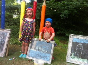 Workshops ran in the morning (which was our first port of call each morning) and afternoon and one that went down really well with Hazel and Gwilym was the beaded keyrings. In spare moments they took it upon themselves to do some chalking on the framed boards that celebrated the 25th anniversary. The central area was fenced off and was soon filled with willow and paper peacocks which made a lovely centrepiece for the kid’s area.