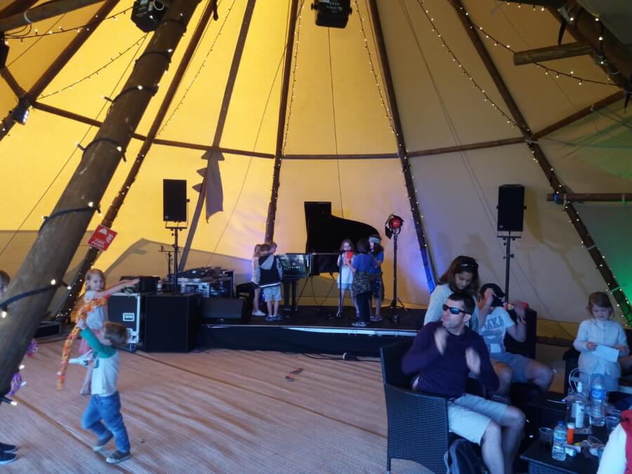 If guests were prepared to pay a bit more for their tickets, they could access Love Supremium. This fenced off area had a fantastic view of the main stage. There were a large number of wooden picnic tables and chairs. (However, these were all generally claimed and held on to from quite early on in the day.) Love Supremium had a few food outlets and a bar for the exclusive use of the Supremium wrist band wearers, and of course the added luxury of proper flushing toilets. My two children enjoyed the table tennis in the corner of this area. That suited me as I could watch the bands as they played. The bar had a mini grand piano for anyone to play on. The drinks were served in real glass glasses – very posh for a festival!