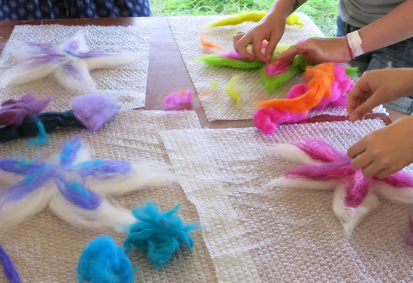 Our kids made record players from a 7″ vinyl, a piece of card, a pin and a 2p coin – they were fascinated! We also watched carrots being turned into flutes, made whimsical woodland creatures from clay, danced the 5 rhythms, made upcycled squids and learned about auras. The highlight was perhaps the wonderful felt flowers, as they make such a beautiful memento of our time at WOOD.